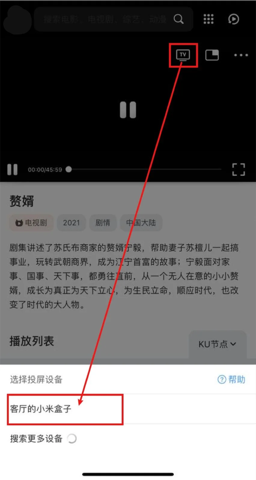打开安卓UC浏览器->打开彤彤私人订制影院->开始播放->全屏->左下角投屏->等待搜寻到智能电视/电视盒子->选中,即可投屏。