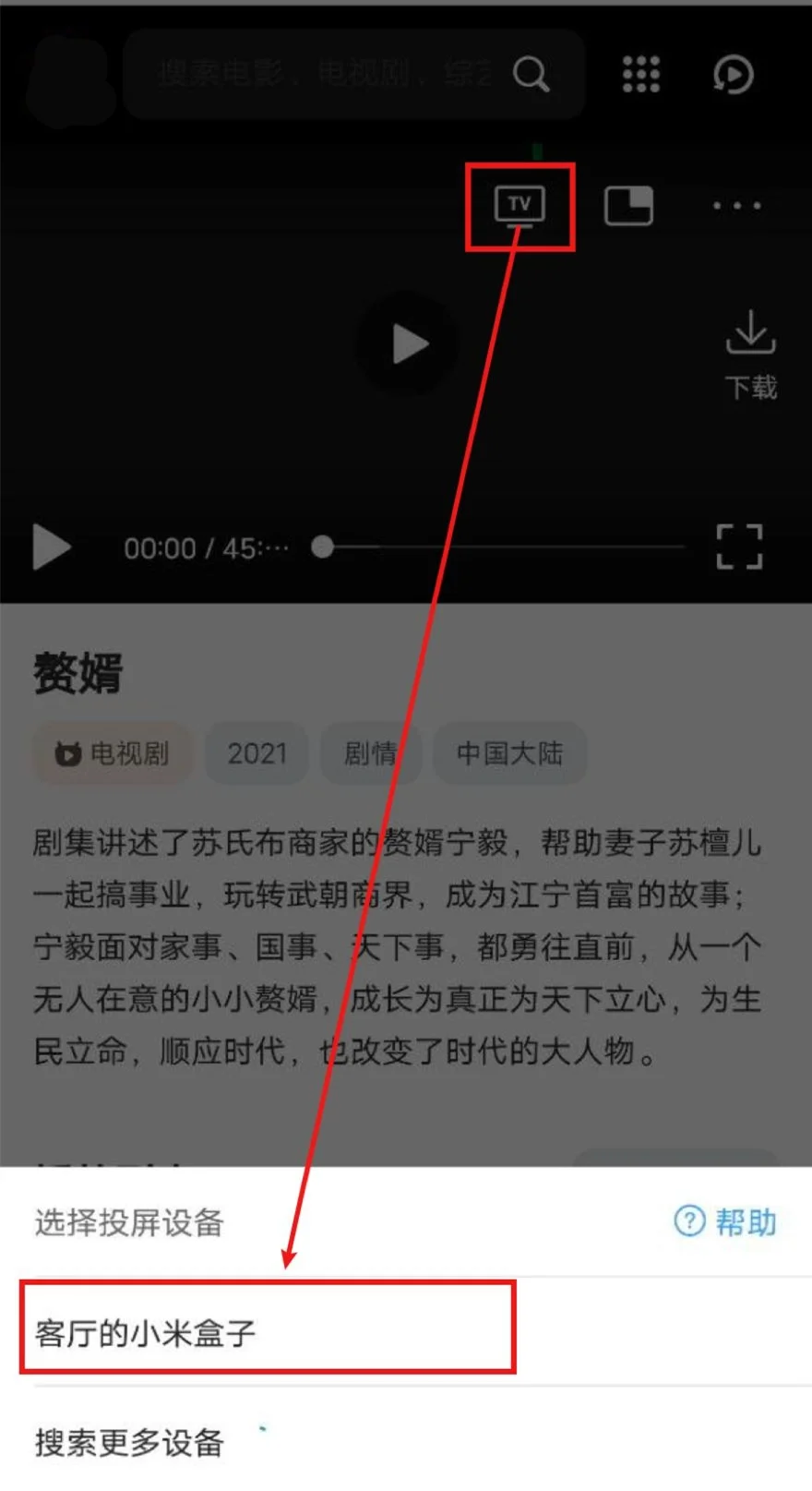 安卓夸克浏览器->打开彤彤私人订制影院->开始播放->全屏->左下角投屏->等待搜寻到智能电视/电视盒子->选中,即可投屏。